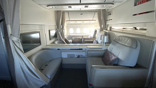 登机后,您将在机舱的单排中拥有四间优雅套房中的一间——每间套房都跨越四个窗户。La Première 套房在技术上并非完全封闭,但通过窗帘提供额外的隐私。座椅在就寝时完全放平,上面铺有记忆海绵床垫和高支数床单。使用希思黎 (Sisley) 的浴袍、拖鞋、袜子和旅行套装,让您在飞行期间保持舒适。在 35,000 英尺的高空享受餐厅品质的法式美食,为美妙的体验画上句号。