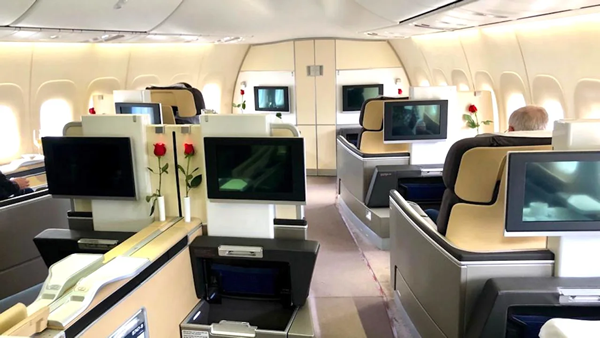 您会在该航空公司的波音 777 飞机上找到头等舱,只占两排。每个座位都足够宽,可以舒适地伸展,并且在座位的另一端是一个脚凳,如果您想与同伴一起用餐或在飞行途中临时开会,可以配置为额外的乘客坐下。