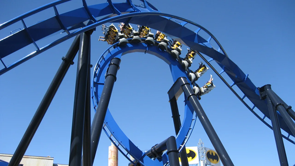 这款以 Caped Crusader 主题为主题的钢制过山车有五种倒置方式,包括第一次坠落后的 360 度全环。