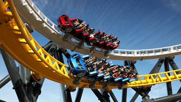 这个赛车过山车有两条并排的轨道,有四个独立的高速磁力发射和 14 个轨道交叉。