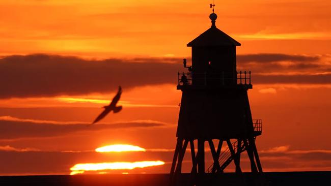 年秋分期间,英格兰赫德格罗恩灯塔 (Herd Groyne Lighthouse) 会出现南瓜色的日出,该灯塔守卫着北海附近的泰恩河河口
