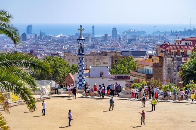人们从桂尔公园欣赏巴塞罗那的全景。西班牙这座热门城市的春分精确时刻为周六上午 8:50