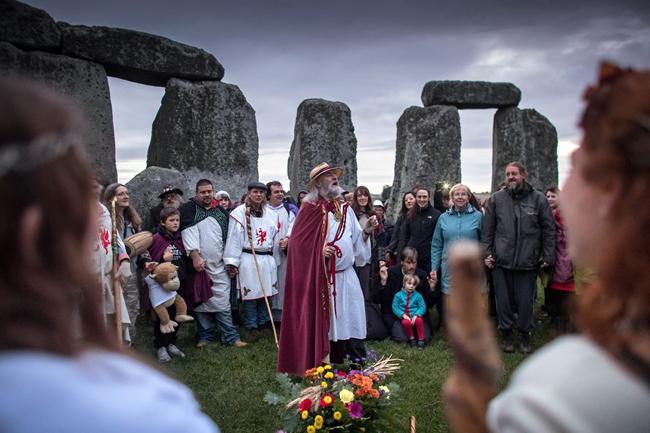德鲁伊、异教徒和狂欢者聚集在英国巨石阵中心庆祝秋分