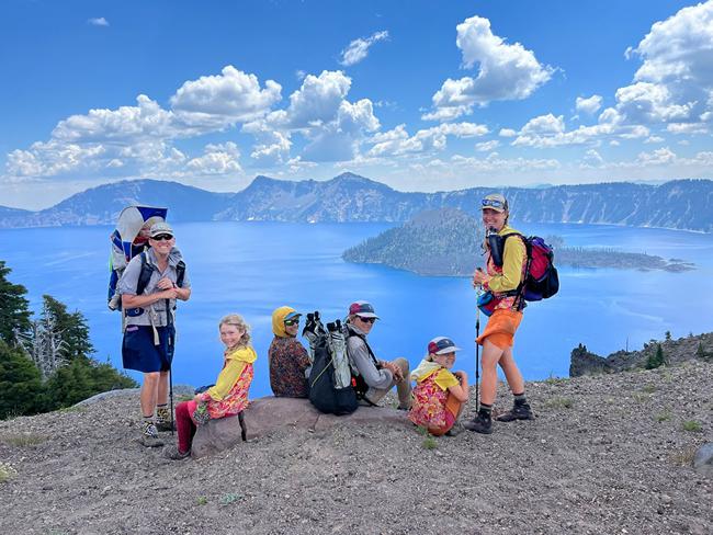 一家七口在火山口湖,这是北美最深的湖,位于俄勒冈州