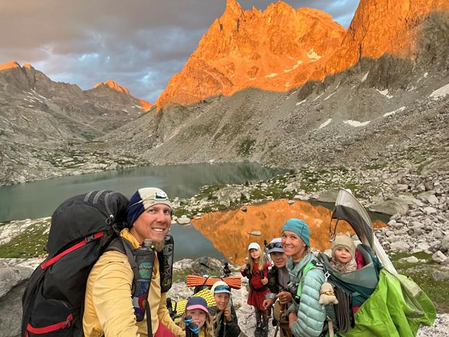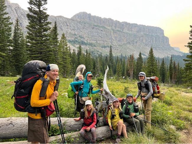 奥伦·内特伯格(Olen Netteburg)(最左边)、他的妻子达娜厄(Danae)和他们的五个孩子莱尔(Lyol)、赞恩(Zane)、艾迪生(Addison)、杜松子(Juniper)和派珀(Piper)在大陆分水岭步道上