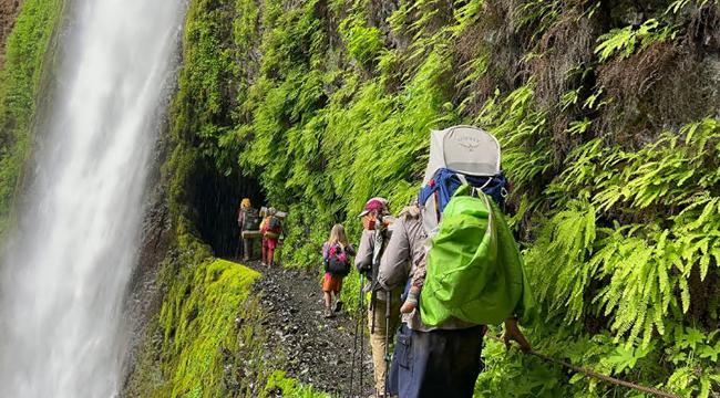 穿越瀑布:一家人穿过 Eagle Creek,这是 Pacific Crest Trail 沿线的一条热门替代路径