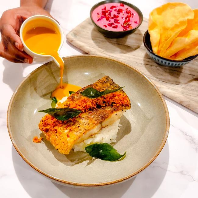 Nadodi 将其与炸干鱼和泡菜一起享用,全部分层放在一个迷你陶罐中。“这道菜很正宗,通过提升味道和精致的摆盘方式唤醒人们的记忆,”威廉姆斯说。