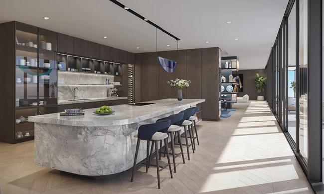 顶层公寓的内部效果图由 BAMO 公司设计,展示了一个现代化、通风的单元,配有环绕式窗户、封闭式阳台、嵌入式照明和豪华大理石饰面。客房设有私人健身房、水疗中心、图书馆和剧院。