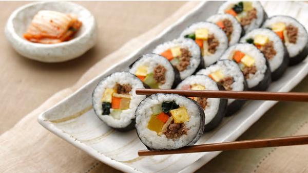 紫菜包饭:将 炒蔬菜、碎牛肉、甜腌萝卜和米饭卷起来,紧紧包裹在一张紫菜中,然后切成一口大小的圆形。紫菜包饭的制作过程类似于意大利千花玻璃工艺,事实上,成品紫菜包饭往往看起来太漂亮了,难以下咽。炒蔬菜、碎牛肉、甜腌萝卜和米饭,卷起来并用紫菜海藻(gim)紧紧包裹,然后切成一口大小的圆圈。