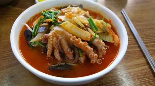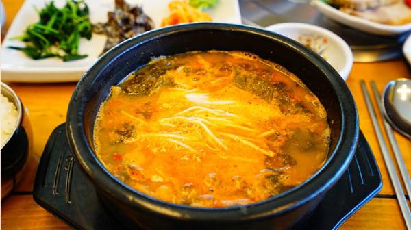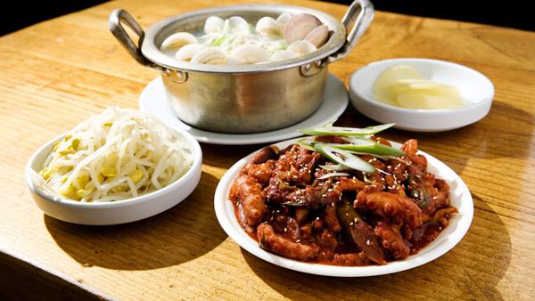 泥鱼汤:这道汤的卖点是泥鱼和蔬菜(绿豆芽、萝卜干、红薯茎,以及最薄而精致的外层卷心菜叶)的粗糙但令人满意的质地。这种辣汤的稠度更接近炖菜。尽管被捣碎并煮至无法辨认,但chueotang因其构成主要成分的淡水泥鱼(chueo)而得名。但这汤的卖点是泥鱼和蔬菜的粗糙但令人满意的质地——绿豆芽、萝卜干、红薯茎,以及最重要的是薄而精致的卷心菜外叶。
