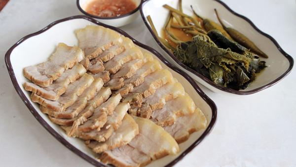 Bossam——一种非常韩国的吃猪肉的方式。与许多韩国肉类菜肴一样,Bossam 的核心很简单:蒸猪肉。但这道菜的关键在于,将蒸猪肉切成比一口略大的方块,用生菜、紫苏或泡菜的叶子精心包裹,并涂上蘸酱。有两种传统选择:ssamjang(由辣椒酱和黄豆酱(doenjang)制成)或 saeujeot(一种由小腌虾制成的咸粉色酱汁)。包裹和浸渍是必不可少的。