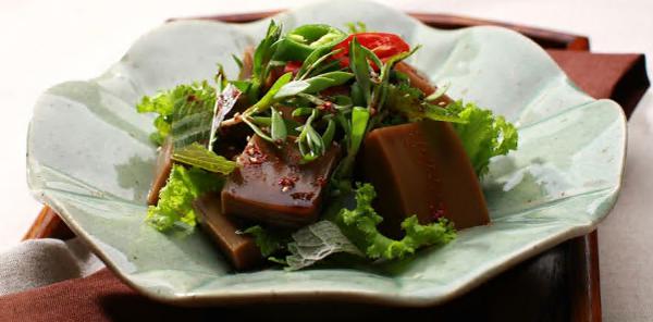 这种浅棕色果冻由橡子淀粉制成,冷食时通常配上切碎的韭菜和酱油作为配菜,或作为 Dotorimuk 沙拉和 dotorimukbap(dotorimuk 米饭)的配料。和豆腐一样,dotorimuk虽然营养丰富且适合素食主义者,但其本身的味道却平淡无奇。味道独特,只能用橡子来形容——苦而不是坚果味。尽管 dotorimuk 可能是一种后天习得的口味,但大多数 dotorimuk 菜肴都含有大量开胃的香料和调味品来帮助整个过程。