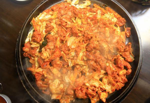 在这道菜中,将鸡肉块浸泡在辣椒酱和其他香料的酱汁中,然后在大锅中与年糕、卷心菜、胡萝卜和红薯片一起炒。排骨系列的另一端是学生最喜欢的低成本春川鸡排。春川是江原道的一座城市,它开发了自己独特的烤腌鸡的方法。在这道菜中,将鸡肉块浸泡在辣椒酱和其他香料的酱汁中,然后在大锅中与年糕、卷心菜、胡萝卜和红薯片一起炒。由于红色的达格比酱容易飞溅,因此经常可以看到许多食客在做饭和吃饭时在衣服上系围裙。
