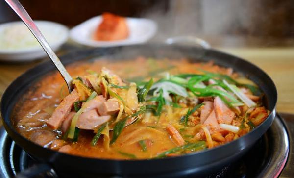 这道香肠、午餐肉、美国奶酪、方便面、年糕和什锦蔬菜的大杂烩。由于肉类稀缺,厨师们在驻扎首尔的美国陆军基地的剩余食物中找到了创造性的替代品,这道炖菜因此得名。虽然从那时起肉已经变得很丰富,但是没有垃圾邮件的佛陀jjigae是不可想象的。