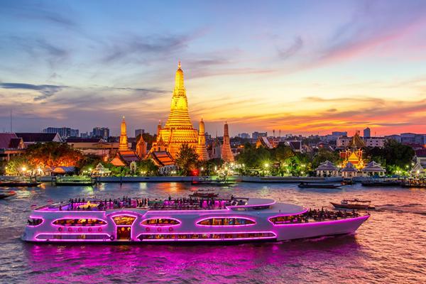 一艘船驶过泰国曼谷的郑王庙。泰国的法定饮酒年龄是20岁