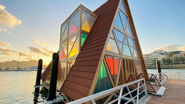 2021年,这一概念以浮动“音乐中心”的形式在西非海岸佛得角港口城市明德卢半永久扎根。该文化中心分布在三个三角形的木质和钢制展馆中,包括漂浮在海上的表演空间、酒吧、食堂和录音室,并通过走道与海岸相连。