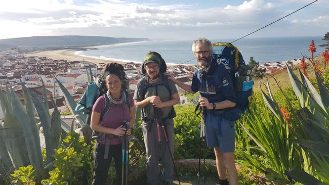 作者(最右边)带着他在旅途中结识的两名瑞士朝圣者出发