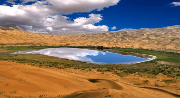 古鲁乃湖是一个巨大的湖泊,南北长180千米,东西宽10千米。湖滨地带植物生长茂盛,常常能看见骆驼在这里啃食。湖水中丰富的生物饵料吸引了众多鸟类,它们的鸣声在湖面上空回荡,给这片沙漠带来了一丝江南的风情。巴丹吉林沙漠腹地的泉水更是难忘,它们是荒漠中的清泉,清澈甘甜,仿佛是摩西为以色列人在旷野中击打磐石所流出的水。