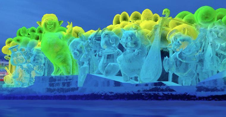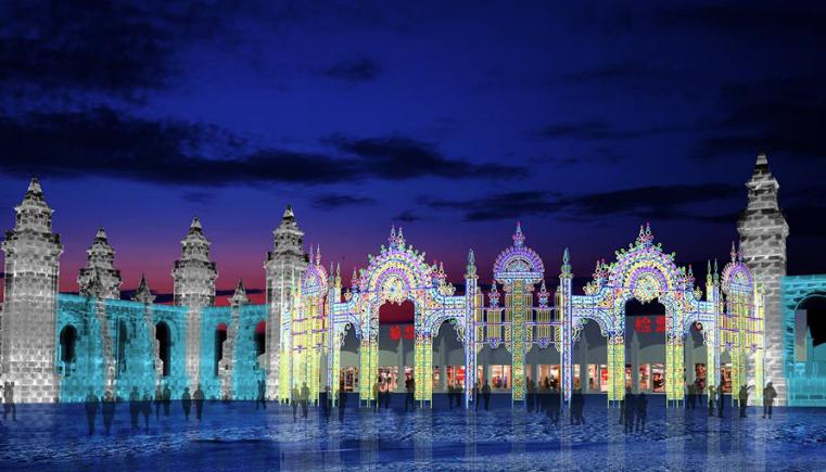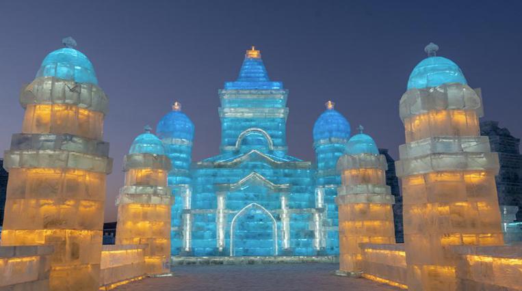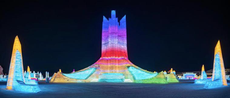哈尔滨冰雪大世界的标志性建筑——主塔“冰雪之冠”。这座高43米,相当于16层楼高的冰塔,用冰量达1.3万立方米。在灯光的映照下,它熠熠生辉,仿佛是冰雪王国中的一座璀璨明珠。在冰雪大世界里,欣赏到其他各种冰建景观,如“冰心筑梦”“童话王国”“穿越城堡”“数字冰林”“冰雪历程”等。这些景观均已修建完毕,灯光调试也接近尾声,它们以独特的冰雪语言,讲述着一个个动人的故事。