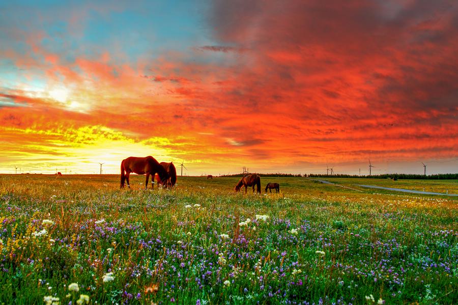 多变的天气,带来奇特的温差,忽儿凉爽如秋,忽儿温馨如春,有时炎热如夏,偶尔这里还会有轻盈的雪飘,故有‘早穿皮袄午穿纱,抱着火炉吃西瓜”之说。但是由于夏季特别凉爽,被人们称为草原的最佳避暑胜地。辉腾锡勒风能稳定性强,持续性好,品质高,成为亚洲最大的风力发电场也成为灰腾锡勒旅游区一道亮丽的风景线。