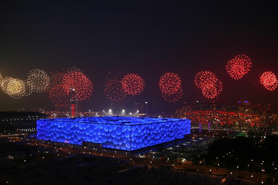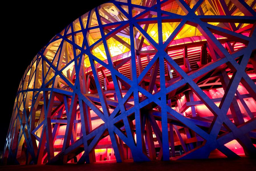 鸟巢(国家体育场)2008年北京奥运会的主体育场,建筑面积25.8万平方米,可容纳观众9.1万人,由树枝般交错的钢材组成,形状像鸟巢,它的外观简洁大方,像一个温馨的鸟巢,象征着和谐、团结、力量和体育精神。它的设计采用了仿生学原理,外观模仿了鸟巢的结构,寓意生命的诞生和希望。