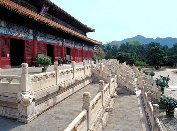 1:长陵(明成祖)天寿山主峰南麓,是明朝第三位皇帝成祖文皇帝朱棣(年号永乐)和皇后徐氏的合葬陵寝。在十三陵中建筑规模最宏伟,营建时间最早,地面建筑也保存得较为完好。它是十三陵中的祖陵,也是陵区内主要的旅游点之一。