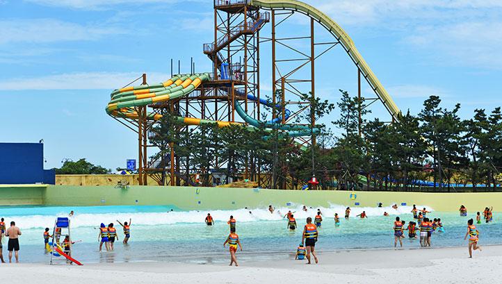 1万多平米的真空造浪池再现“海啸”的汹涌澎湃,巨浪最高时可达3米,是最惊险刺激的水上游乐项目。