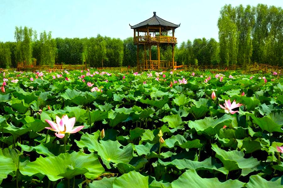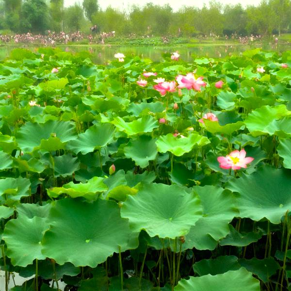 荷花博览园,荷博园的荷花种植面积达到了152989平方米,共有700多个荷花品种。园内荷花来自23个国家和地区,有常见荷花、特育品种及精品荷花20万余株。它们当中,有来自泰国的睡莲,有火焰、墨公主、黄鹰,还有科罗拉多,有重瓣红莲、重瓣黄莲、单瓣白莲等常见荷花,也有国庆红、太空飞天、宝珠观音、如意观音等特育品种,以及上海一号、中国红等精品荷花,令人值得期待的还有鲜黄色的美洲黄莲、黄绿色的精苹果等国际名荷花和黄金时代、玛珊姑娘、奥毛斯特等国际名睡莲。其中最昂贵品种来自北美洲,每株价值3000元人民币。等众多品种。最引人注目的要数“地涌金莲”,这种莲花原产中国云南省,四川省也有分布,系中国特产花卉。地涌金莲被佛教寺院定为“五树六花”之一,也是傣族文学作品中善良的化身和惩恶的象征。这些难得一见的荷花精品,你都可以在荷博园一睹为快。荷博园的美,美在布局自然,美在浑然天成。
