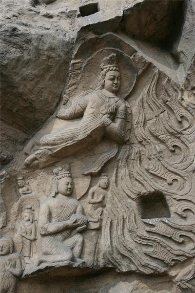 第21至45窟,其特点是不成组的窟多,中小窟多,作为补刻的小龛多。造像多为瘦骨清相,衣纹下部褶纹重叠,神态文雅秀丽,藻井中飞天飘逸洒脱,具有浓厚的汉化风格,与“龙门期”雕刻十分接近。其中第38窟北壁“幢倒乐神”浮雕,是研究北魏杂伎的形象资料。