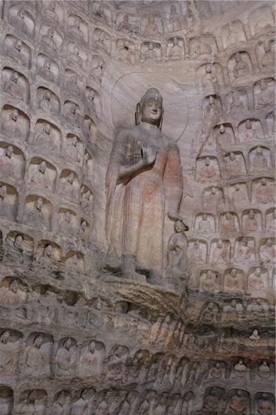 云冈石窟是在北魏中期齐凿的。北魏经历了“太武灭佛”、“文成复法”。文成帝和平年间(460——465)云冈石窟开始大规模营造,到孝明帝正光五年(524)建成,前后计60多年。初由著名的高僧昙曜主持,“于京城西武州塞,凿山石壁,开窟五所”。现第16至20窟就是“昙曜五窟”。