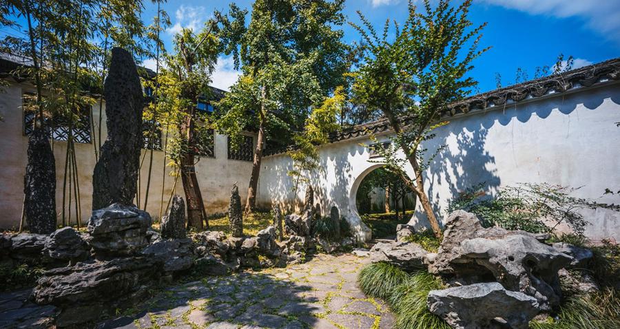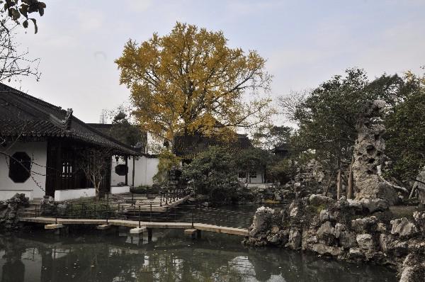 中以复廊相隔,廊壁花窗,沟通东西景色,得以增加景深。廊东以庭院建筑为主,曲廊环绕亭院,缀以花木石峰,从曲廊空窗望去皆成意蕴丰富的国画。