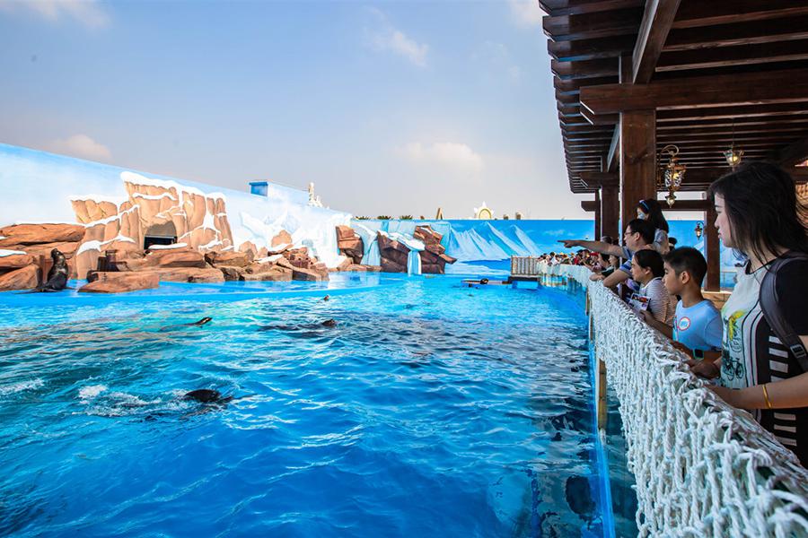 这个公园拥有六大明星剧目,包括《虎鲸科普秀》、《海狮特快》、《海豚恋曲》、《白鲸之恋》、《人鱼童话》和《水舞鱼间》。这些表演通常在各种剧场中举行,比如虎鲸剧场、海豚剧场、海象剧场、冰山剧场、奥特曼场馆、火山剧场和海底剧场。