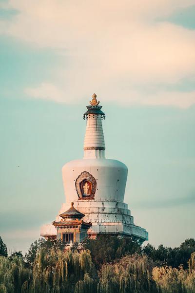 白塔,位于琼华岛高处,是一座藏传佛教塔。塔高36米,上圆下方,为须弥山座式,塔顶设有宝盖、宝顶,并装饰有日、月及火焰花纹,以表示"佛法"象日、月那样光芒四射,永照大地。白塔矗立于琼岛上,绿荫拥簇,巍峨壮美,堪称北海公园的标志。