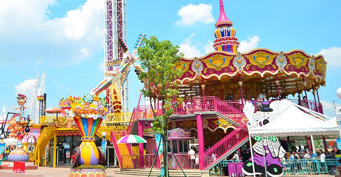 欢乐时光是最具激情的主题区,它以马戏团与嘉年华相融合的文化特色为背景,突出欧洲马戏的滑稽幽默和灿烂多彩的节日狂欢,营造出热烈的海岸风光以及热闹的派对风情。