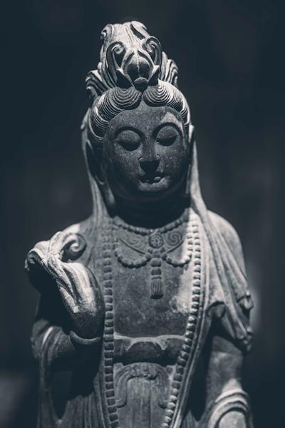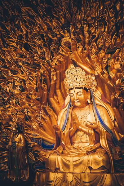 宝顶圆觉洞,为整石开凿,宽敞如室。洞正壁刻佛像三尊,主佛前有跪菩萨一尊,俯首合十,恭敬虔诚,左右壁为十二圆觉菩萨,跌坐莲台,妙丽庄严,姿态不一,衣服、肌肉质感真实,似薄纱突身,衣裙流畅自如。壁间刻楼台亭阁,人物鸟兽,花草树木,幽泉怪石,近似写实作品,是大佛湾雕刻的精华。