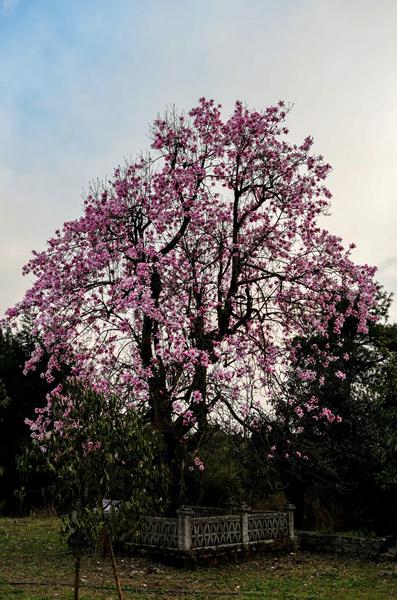 万紫千红的杜鹃花是戛木景区的一大特色,全景区地界内都有杜鹃花,最集中的是戛木街尾和“四棱碑”一带。这些杜鹃花树,根牵着根,枝连着枝,花缀着花,十分密集。树高三至四米,苍老虬劲,高矮差别亦不大,面积一万余亩。因海拔偏低,杜鹃开花要比普底景区、金坡景区一带提前十天左右,以马缨杜鹃为主。杜鹃花树密集,品种不复杂,花期相对集中。景区里或有那么三五十株杜鹃花则与众不同,每年正月十五左右春寒料峭就开始开放,花期特长,待到其他杜鹃花已花飞花谢,完成使命,它们才慢慢榭去。有人说这是先烈鲜血浇灌的缘故。