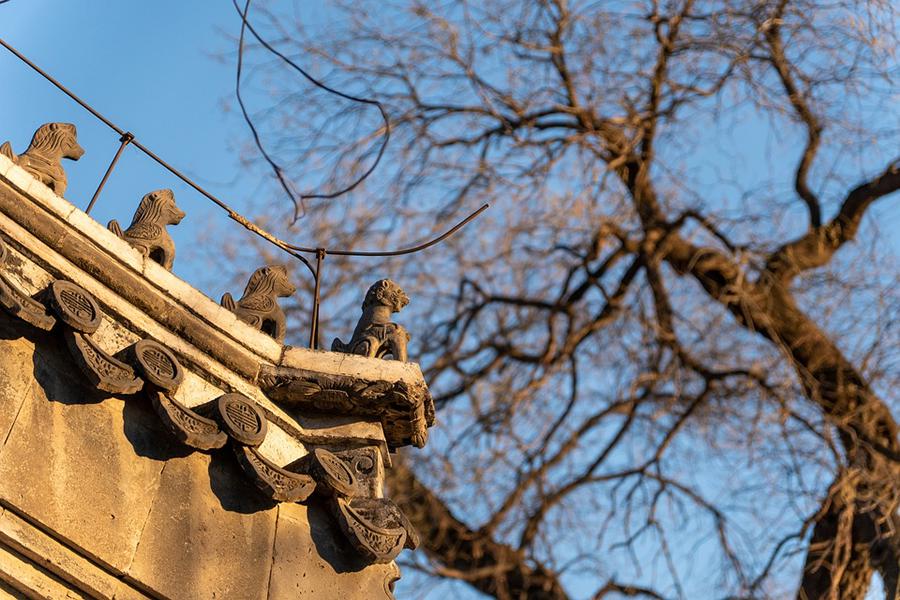 砖雕拱门,金刚墙以上均为砖雕,上刻花卉走兽,顶部栏板雕有暗八仙图案。整个拱门上的砖雕,布局严谨,凹凸得当,其做工之细,刀法之精,实属罕见。