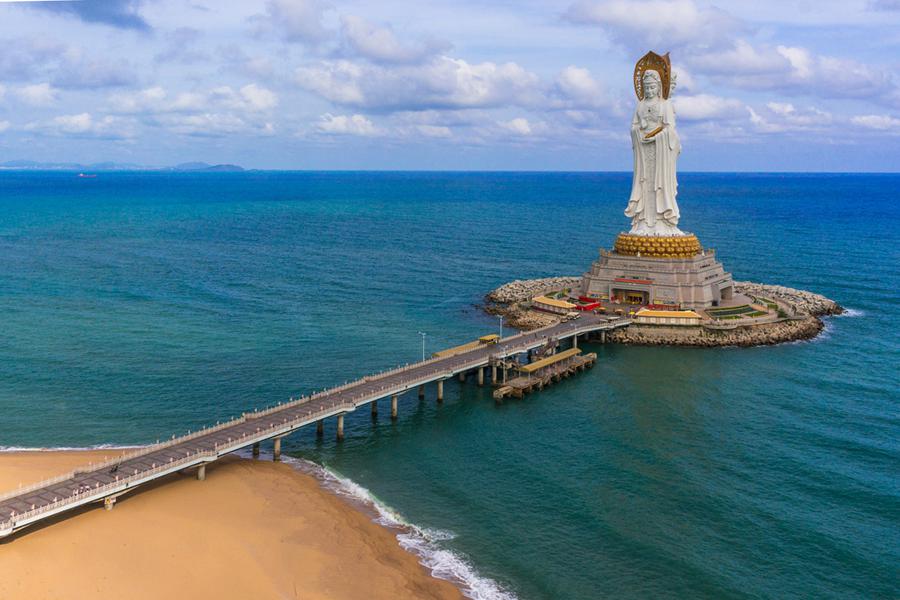 南山文化旅游区内遍布气势恢宏的佛教建筑,高108米的观音菩萨圣像立于南海碧波之上,巍峨壮观,一体化三尊,分别持珠、持箧、持莲,寓意着慈悲、智慧、和平。南山寺内都不乏形态各异、精雕细琢的佛教圣像。