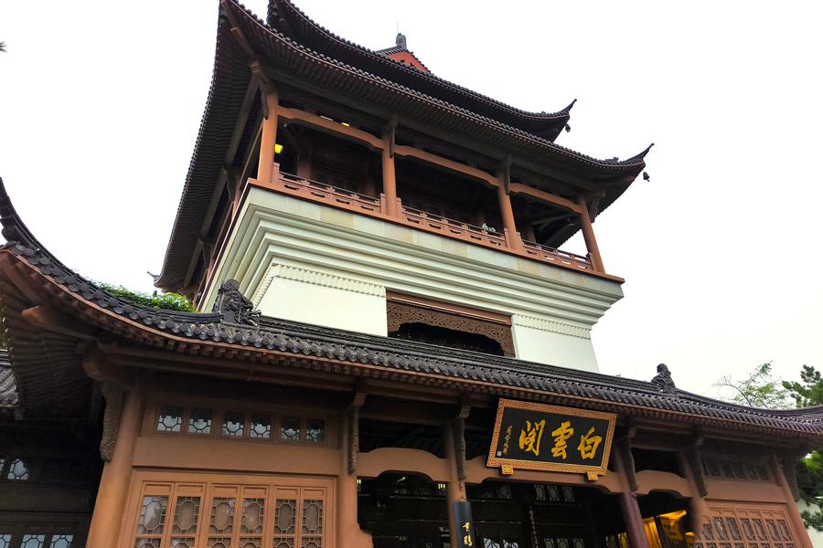 1992年1月竣工的今白云阁建在原公安消防瞭望台的旧址上。外观为塔楼式,呈“T”字型。屋顶为重檐歇山十字脊屋面。地面一层与二层衔接处采用了大板块的白色作为台基主调,寓意白云阁飘浮在白云之间。其造型融合了中国传统民间工艺和宋、明、清各时期的建筑风格,既典雅秀逸,又古朴庄重,兼具游览和展览功能。整个建筑系钢筋混凝土仿古结构。