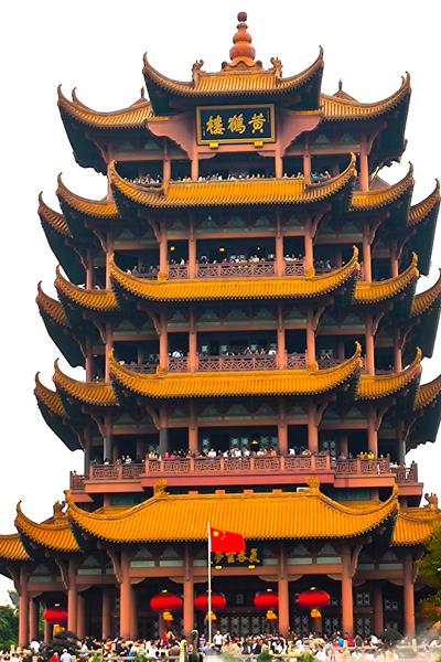 黄鹤楼,地处蛇山之巅,黄鹤楼始建于三国吴黄武二年(223年),仅明清两代,就被毁7次,重建和维修了10次,历代屡加重修,现存建筑以清代“同治楼”为原型设计,重建于1985年。黄鹤楼因唐代诗人崔颢登楼所题《黄鹤楼》一诗而名扬四海。三国时期黄鹤楼只是夏口城一角瞭望守戍的“军事楼”,晋灭东吴以后,三国归于一统,该楼在失去其军事价值的同时,随着江夏城地发展,逐步演变成为官商行旅“游必于是”、“宴必于是”的观赏楼。