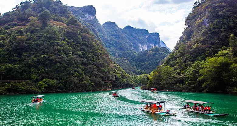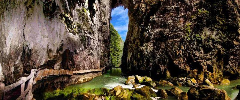 荔波樟江风景区由小七孔景区、大七孔景区、水春河景区和樟江风光带组成。小七孔湖面很大像迷宫一般,四周被浓密的植被包围,游览途中会感觉很惊险。水春河漂流是比较有名,从小七孔去大七孔之后即可来一次刺激的漂流。