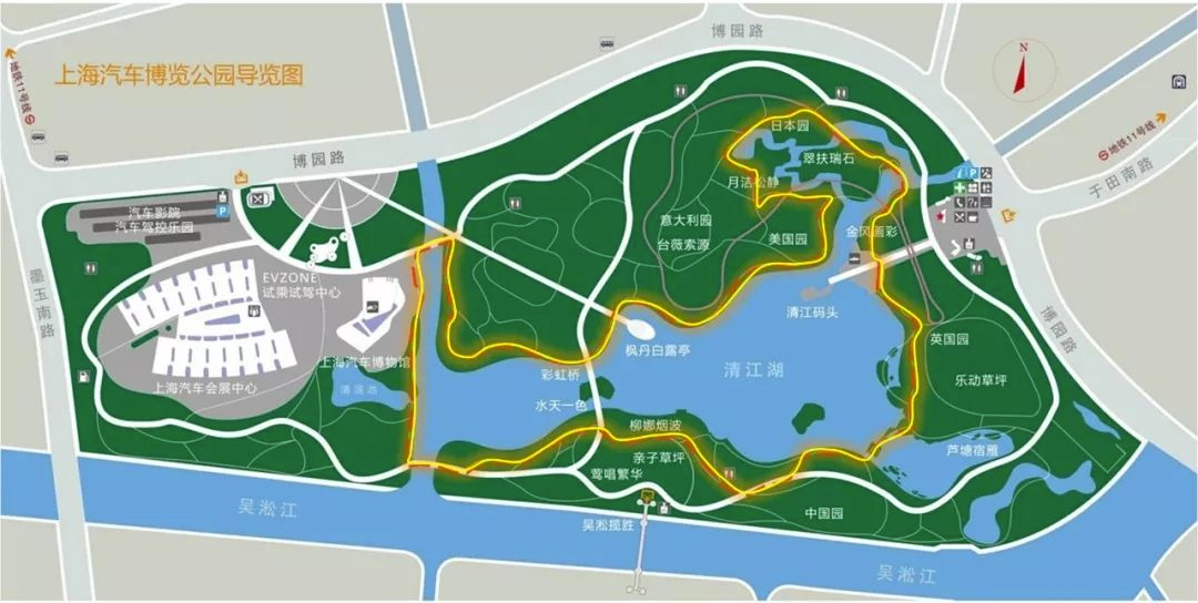 人行漫步道的路线:游船码头—--体验桥--—石板桥—日本园—溪流步道—沿湖步道—木桥—石拱桥—亲子草坪—沿湖步道—亲水露台—英国园—游船码头。步道全长约3.64公里。全程步行时长约1.5小时。