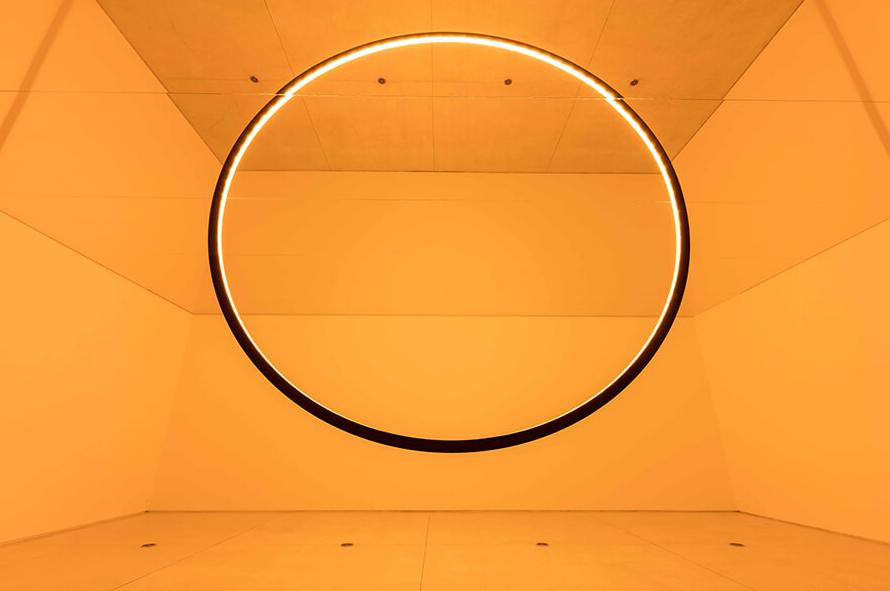 镜面箔、单频光、铝、油彩(白、黑)450×900×12 cm。在一个天花板贴有大镜子的房间里,一个巨大的光环看起来似乎跨越了房间的实体空间和它在镜中映像之间的界线。由一系列的单频灯发出的光芒将一切色彩化为黄灰色调,令观者的视觉感知变得锐利起来。这种为增强安全性而常用于隧道照明的灯,曾在埃利亚松的多件作品中出现,包括 2003年在伦敦泰特现代美术馆展出的《气候项目》。