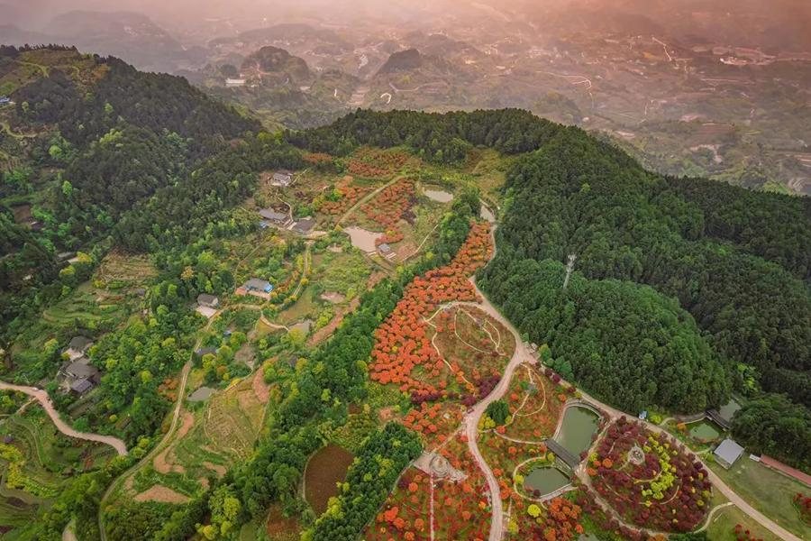 2月,红梅、桃花、春鹃、红叶次第绽放;