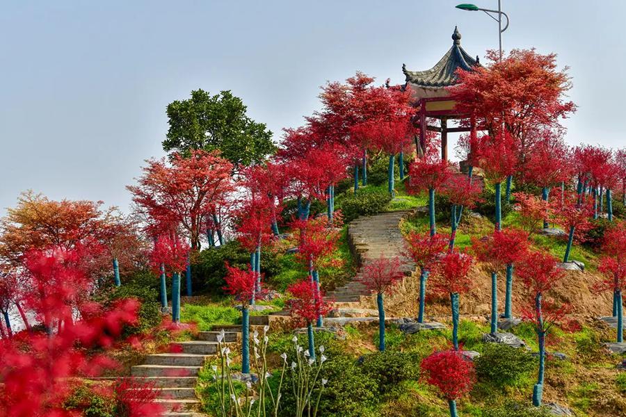 五洲园,占地千余亩以红枫为主要特色,园区育有名贵珍稀花木逾百万株,玫瑰、石榴花、映山红、桂花、樱花、玉兰、紫荆、西洋鹃、有色灌木等。种植有亚洲红枫、美国红枫、大花青枫、锦秀枫(又名“梦幻枫”)等多种枫树。其中,锦秀枫是五洲园创新培育的名贵珍稀彩叶枫种,能在春、夏、秋三季呈现不同的颜色变化,极具观赏价值。红枫的最佳观赏季节为春季和秋季,春季红枫如火焰般鲜红,秋季则层林尽染,美不胜收。