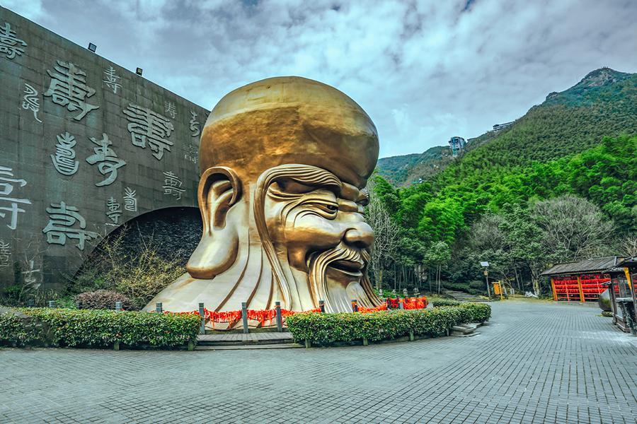 地标打卡建筑——寿星雕塑所在地,雕塑由纯铜制作,这位笑容可掬、慈祥亲切的老寿星身体是整个山坡,两侧山峰是左膀右臂。被称为中国第一寿星,在其后方的照壁上还有着68种不同字体的寿字。据说景区内共有100种不同字体的寿字,其余的31种寿字在山上的石块上容易找到。还有一个寿字在哪呢?其实这个寿字并不在山上,而是在每个人的心中。