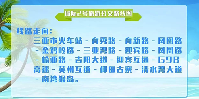 城际2号线路是从三亚火车站发车,终点站为南湾猴岛,全程共83公里。每天上午7点至下午4点半,平均20到30分钟发一班车。