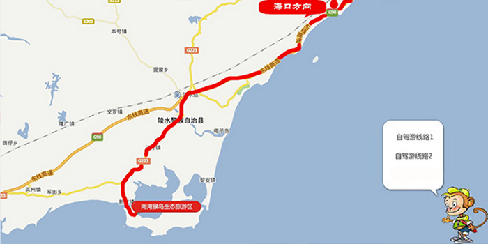 海口、文昌、琼海、万宁等地通往南湾猴岛生态旅游区自驾线路图