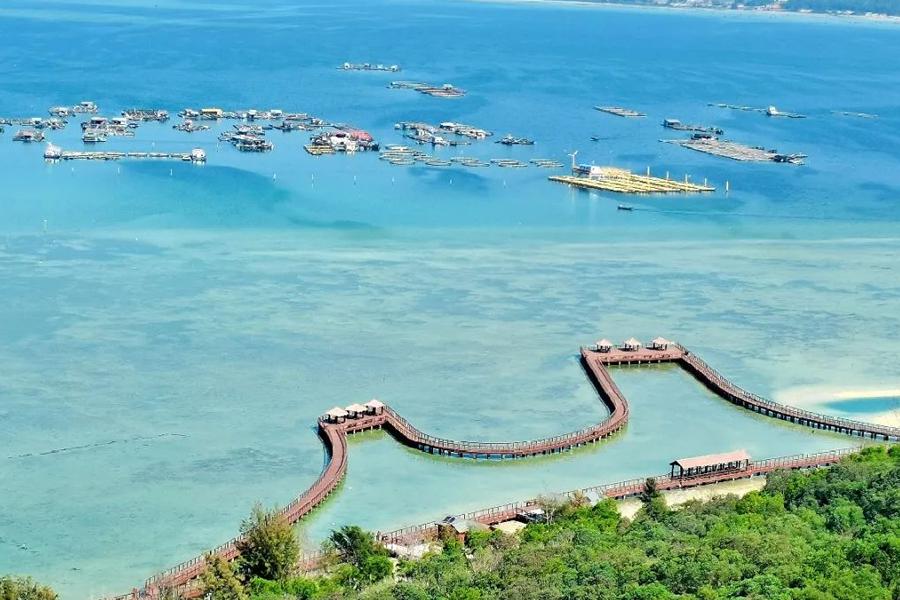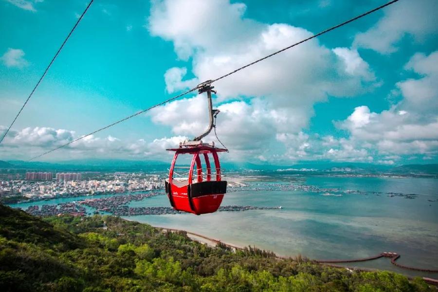 2.乘坐索道方式上岛,乘坐长达2千多米的跨海高空观光索道,在半空中一眼饱览脚底下的数百户“水上人家”——疍家人,以及新村港的壮观景象!整个乘索时间大约花费6分钟。