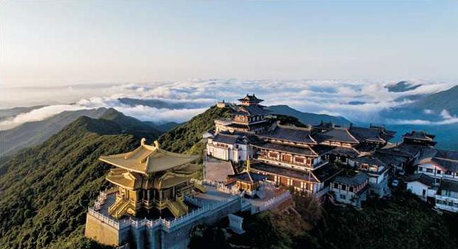 坐落于宝珠峰之巅的大洪山慈恩寺,寺院建筑群依山而建,坐北朝南,以大雄宝殿为中心,成十字形展开,中轴线主体建筑由山门、天王殿、大雄宝殿、藏经阁、佛足阁、金顶依次展开,错落有致,磅礴大气,再现唐宋佛教“楚山望刹”盛景。“金顶”为大慈恩寺核心建筑,金顶是宝珠峰的制高点之一,总建筑面积达1200平方米,纯铜建造,用铜量120吨,高度为15.9米,多项数据名列全国第一。